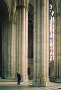 In the spring of 2001, we had the opportunity to accompany several students from the German studies program at our kids school on what would end up being a whirlwind tour of Germany. We arrived in Köln the day before Easter. In the cathedral, I found this gentleman wandering about, carefully studying each of the many stain glass windows. I followed him, biding my time, knowing that he would eventually arrive at the point where I thought there was a picture. Sure enough, he obliged, even striking a cooperative pose for me. Outside, it was heavily overcast and quite dark. The resulting exposure was about 1/4 second at f/5.6. With no tripod, I had to carefully find a spot on one of the pillars to hold the camera against to get the exposure. Because the lighting is such an unpredictable mix of color, skylight through stained glass, interior artificial light with a mix of tungsten, mercury flourescent, and more, often no filtration is no worse than trying to achieve a "correct" color balance.